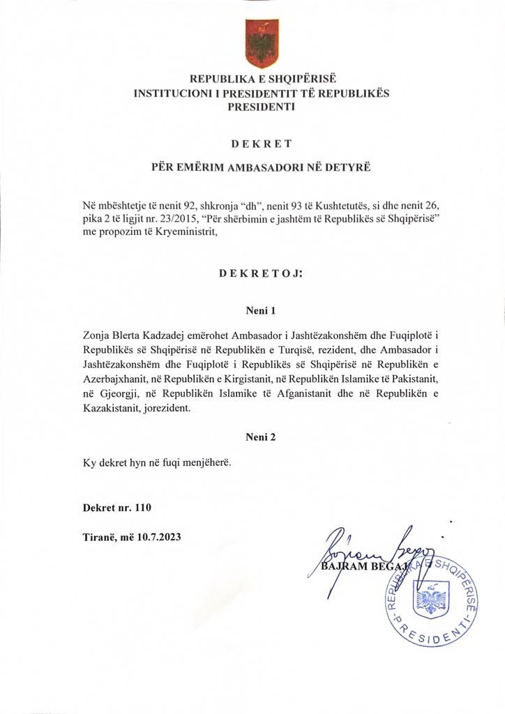 8. Emërohet me Dekret nr. 110 datë 10.7.2023 znj. Blerta Kadzadej, Ambasador i Jashtëzakonshëm dhe Fuqiplotë i Republikës së Shqipërisë në Republikën e Turqisë, rezident, dhe Ambasador i Jashtëzakonshëm dhe Fuqiplotë i Republikës së Shqipërisë në Republikën e Azerbajxhanit, në Republikën e Kirgistanit, në Republikën Islamike të Pakistanit, në Gjeorgji, në Republikën Islamike të Afganistanit dhe në Republikën e Kazakistanit, jorezident.