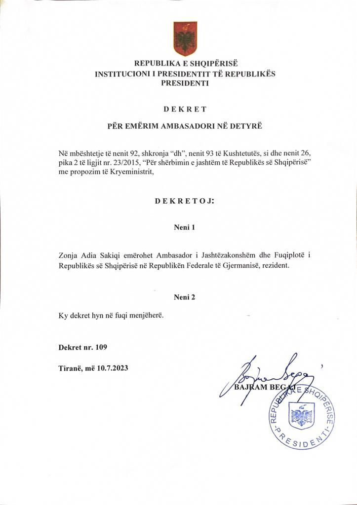7. Emërohet me Dekret nr. 109 datë 10.7.2023 znj. Adia Sakiqi, Ambasador i Jashtëzakonshëm dhe Fuqiplotë i Republikës së Shqipërisë në Republikën Federale të Gjermanisë, rezident.