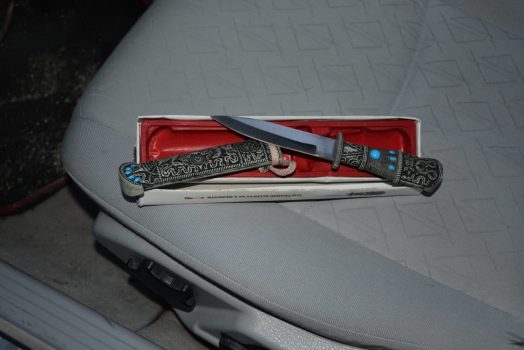 Gjatë kontrollit fizik ndaj tij, iu gjet 1 kartë identiteti shqiptare e dyshuar si e falsifikuar, si dhe në mjet iu gjet 1 thikë dhe 1 sopatë, të cilat u sekuestruan në cilësinë e provës materiale.
