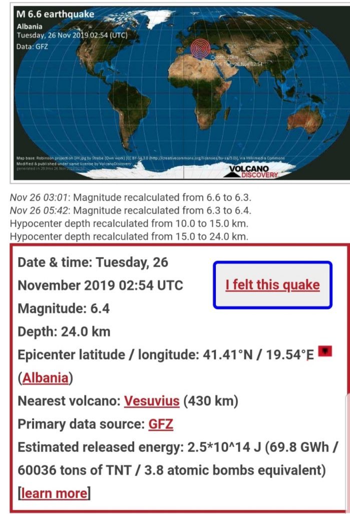 Tërmeti me magnitudë 6.3 ka tronditur ditën e sotme SHqipërinë dhe jo vetëm. Deri më tani zyrtarisht janë 15 persona kanë humbur jetën dhe qindra të tjerë janë plagosur. Faqja ndërkombëtare “Volcano Discovery” ka publikuar detaje nga goditja e fortë e tërmetit. Sipas asaj që thotë kjo faqe, tërmeti i fuqishëm ka qenë i barazvlefshëm me 3 bomba atomike.
