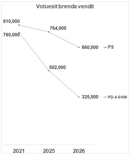 Duke përmbledhur, PD-ASHM ka sot rreth 435 mijë votues më pak brenda vendit se sa më 2021. Ndërsa PS ka vetëm 150 mijë më pak. Si rezultat, epërsia e PS-së është rritur nga rreth 50 mijë brenda vendit më 2021, në rreth 335 mijë sot.