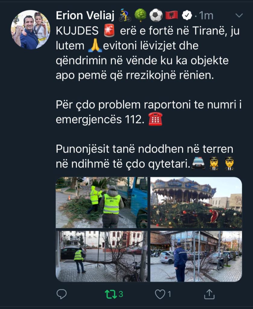 “Kujdes! Erë e fortë në Tiranë, ju lutem evitoni lëvizjet dhe qëndrimin në vende ku ka objekte apo pemë që rrezikojnë jetën. Për çdo problem raportoni te numri i emergjencës 112. Punonjësit tanë ndodhen në terren në ndihmë të çdo qytetari”, shkruan kryebashkiaku Erion Veliaj.