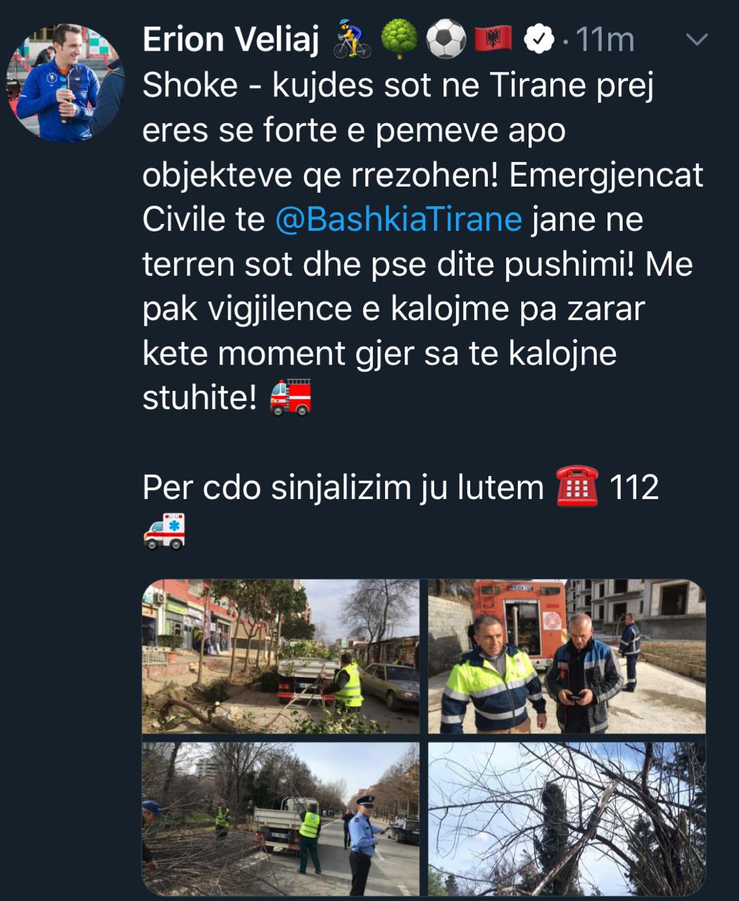 “Shokë – kujdes sot në Tiranë prej erës së fortë e pemëve apo objekteve që rrëzohen! Emergjencat Civile të Bashkisë Tiranë janë në terren sot dhe pse ditë pushimi! Me pak vigjilencë e kalojmë pa zarar këtë moment gjer sa të kalojnë stuhitë! Për çdo sinjalizim ju lutem ☎️ 112 🚑”, shkruan Veliaj në Twitter.