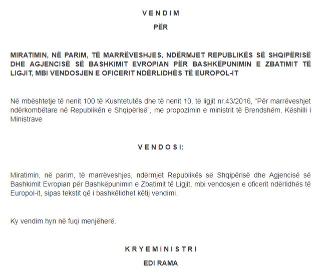 “Në mbështetje të nenit 100 të Kushtetutës dhe të nenit 10, të ligjit nr.43/2016, ‘Për marrëveshjet ndërkombëtare në Republikën e Shqipërisë’, me propozimin e ministrit të Brendshëm, Këshilli i Ministrave vendosi: Miratimin, në parim, të marrëveshjes, ndërmjet Republikës së Shqipërisë dhe Agjencisë së Bashkimit Evropian për Bashkëpunimin e Zbatimit të Ligjit, mbi vendosjen e oficerit ndërlidhës të Europol-it, sipas tekstit që i bashkëlidhet këtij vendimi”,thuhet në vendimin e Qeverisë, që hyn në fuqi menjëherë.