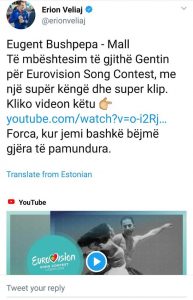Duket se një nga fansat më të zjarrtë të Eugentit është Kryetari i Bashkisë së Tiranës Erion Veliaj. Teksa ka postuar klipin e ri të këngës që do na përfaqësojë në arenën e muzikës europiane, kryebashkiaku Veliaj kërkon mbështetjen edhe të publikut shqiptar për një nga artistët më të mirë të viteve të fundit. “SHPËRNDAJE/SHARE – Eugent Bushpepa – Mall. Të mbështesim të gjithë Eugent Bushpepën për Eurovision Song Contest 2018!
