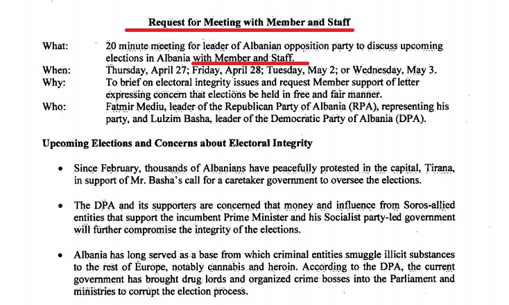 Në 24 Prill 2017 – Kërkesa për takim i drejtohet Departamentit të Shtetit për një takim midis Lulzim Bashës e Fatmir Meidut dhe të Emëruarit Politik në Departamentin e Shtetit. Të Emëruarit Politikë janë punonjës të misioneve të ngritura pranë DSH për marrëdhëniet në politikën e jashtme.