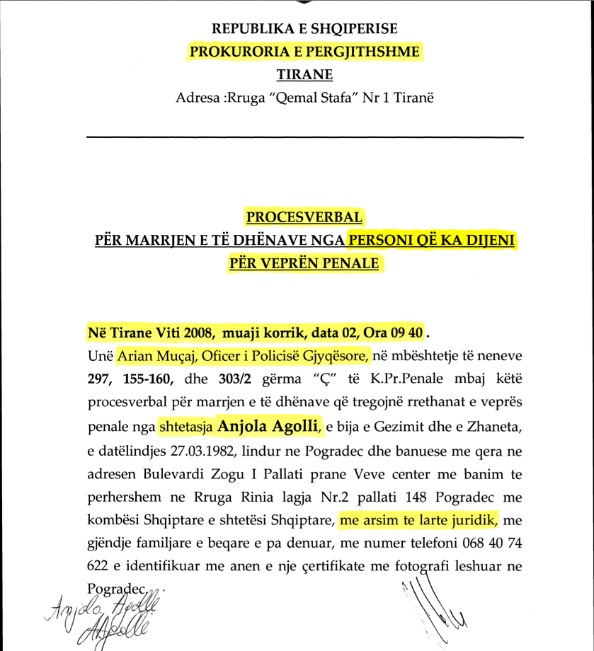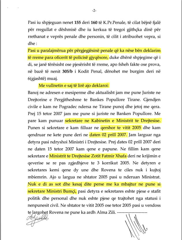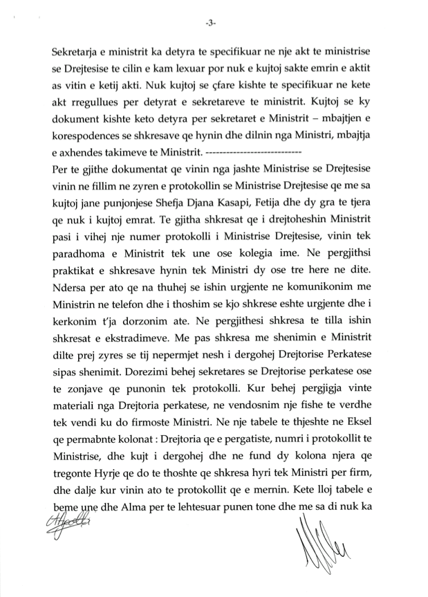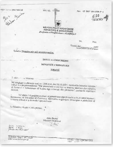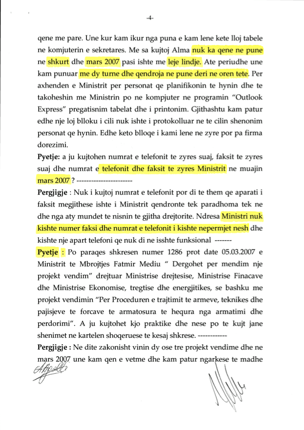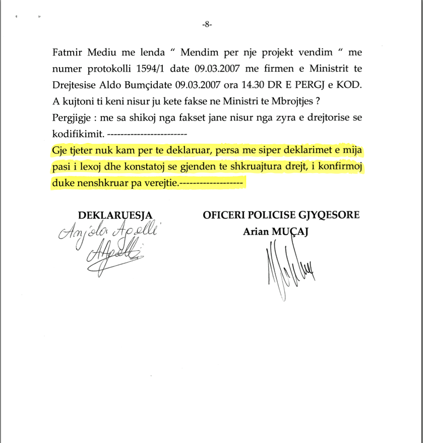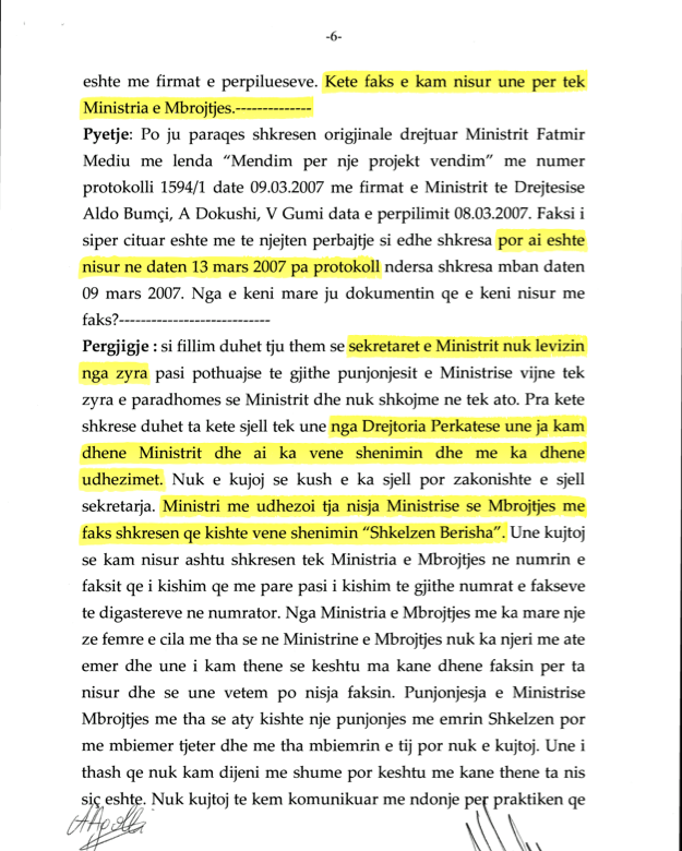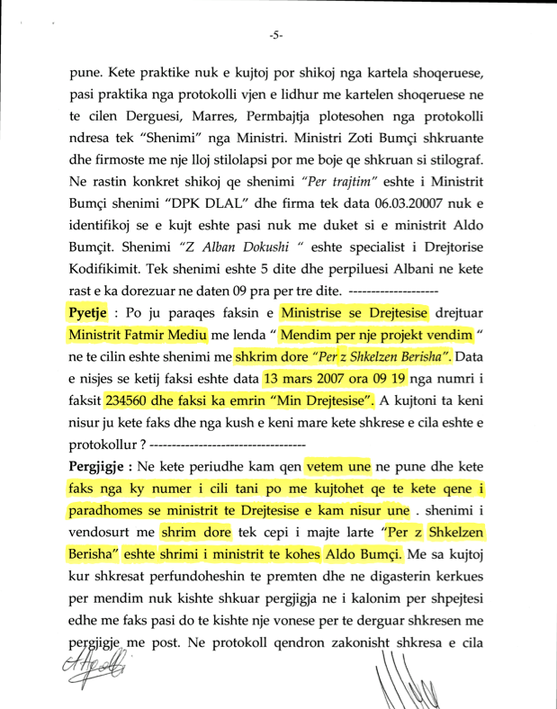 Me poshte keni deshmine para prokurorise se sekretares se ministrit Ado Bumçi, e cila pranon se ka nisur nje faks me shenimin “per Shkelzen Berishen”, permbajtja e te cilit ishte kopje e mendimit te letres qe Ministria e Drejtesise kishte dhene pro projektit te Gerdecit, per te cilin lobonte Shkelzeni.