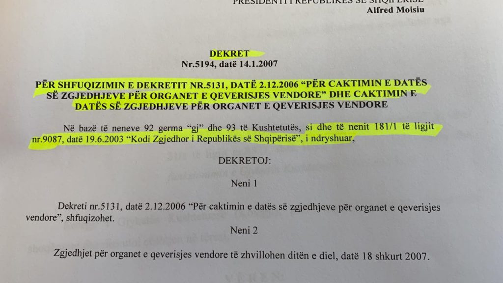 Vetëm pasi mori votën e dy të tretave të kuvendit për këtë ndryshim në Kodin Zgjedhor, Presidenti Moisiu nxori dekretin në 14 janar 2007, siç shihet në faksimile, ku njëkohësisht shfuqizonte dekretin e dy dhjetorit 2006 dhe “në bazë të nenit 181/1 të Kodit Zgjedhor, vendosi zhvillimin e zgjedhjeve lokale ne datën 18 shkurt 2007.