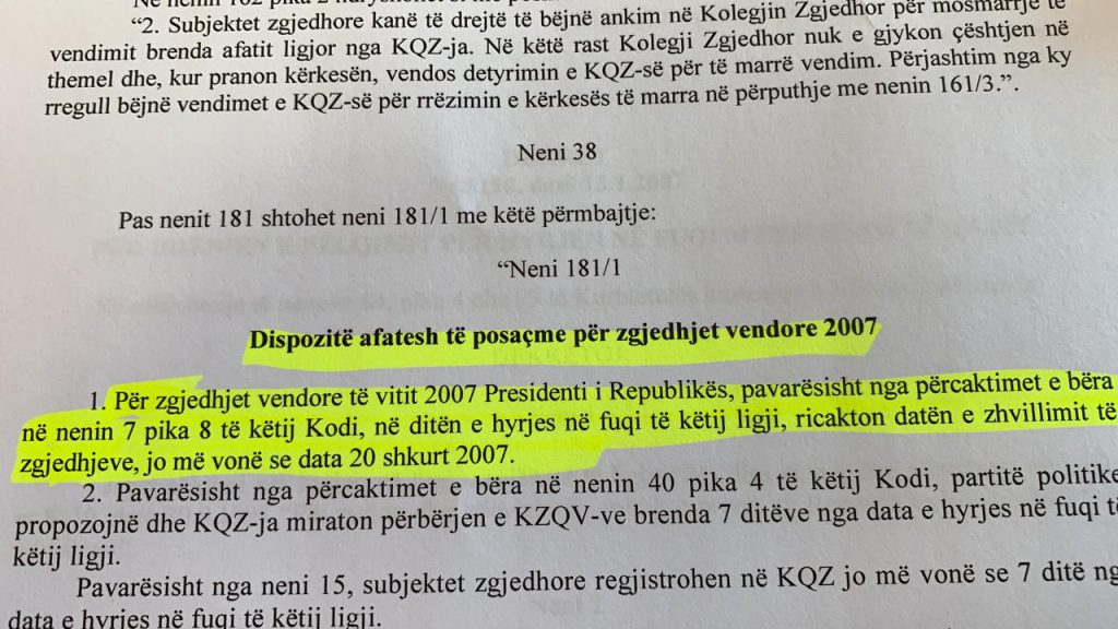 Sipas kërkesës së Moisiut, në nenin 7, pika 8 te Kodit Zgjedhor, përcaktoheshin afatet se kur presidenti nxirrte dekretin dhe njoftonte partitë. Data e rënë dakord, 17 shkurti, dilte jashtë këtyre afateve. Ndaj në nenin shtesë 181/1 thuhej: “Presidenti i Republikës, pavarësisht nga përcaktimet në nenin 7, pika 8 te Kodit Zgjedhor… ricakton datën e zhvillimit të zgjedhjeve vendore, jo më vonë se dara 20 shkurt 2007.”