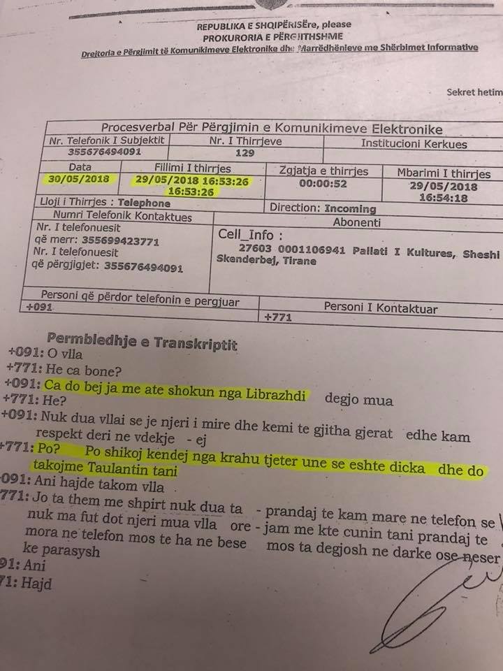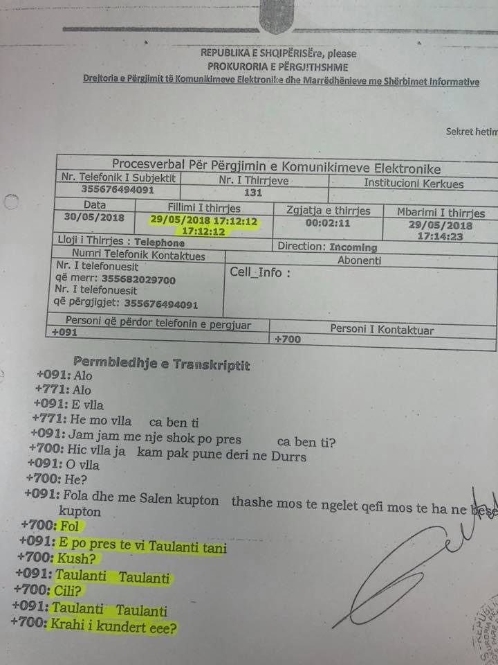 Përgjimet e prokurorisë faktojnë se Taulanti nga Librazhdi, shoku i Alizotit i përgjuar me nr cel +091 flet me drejtorin e policise Fier dhe me persona të tjerë!