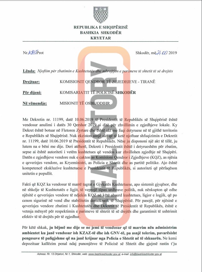 “Në datat 27 Qershor 2019 – 2 Korrik 2019, në kushtet kur nuk ka një Dekret të Presidentit të Republikës për caktimin e datës së zgjedhjeve, në ambientet që ishin vënë në dispozicion paraprakisht për KZAZ dhe GNV, është planifikuar të jenë në dispozicion të qytetarëve për aktivitete të ndryshme artistike, kulturore dhe letrare, që do të organizohen nga njësia e qeverisjes vendore, apo për tubime që do të organizohen në përputhje me të drejtën kushtetuese të lirisë së tubimit, sipas nenit 47 të Kushtetutës. Këtë njoftim po e bëjmë për efekt të detyrimit që ju keni për të mos çuar dëm materialet zgjedhore, sepse zaptimi i ambienteve tona me materiale që nuk janë të autorizuara nga ne të futen brenda, do të shkaktojë asgjësimin e tyre të menjëhershëm, në funksion të lirimit të ambienteve”, paralajmërohet në kërkesë.