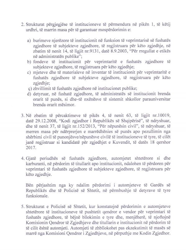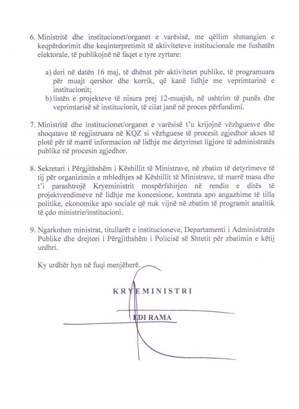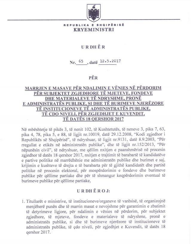 Kryeministri Rama ka nxjerrë një urdhër për ndalimin e përdorimit të mjeteve dhe fondeve të administratës nga subjektet zgjedhore në fushatë. Urdhri i kryeministrit ndalon që makinat shtetërore dhe burimet njerëzore të administratës të përdoren në fushatë. Nga ky urdhër i Kryeministri përjashtohen përdorimi i mjeteve të Gardës dhe të Policisë. /ma.me