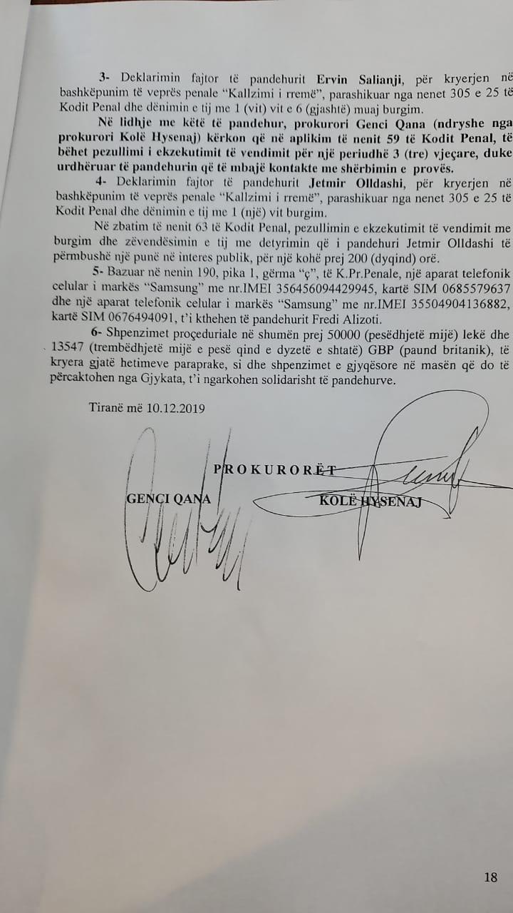 Në përfundim të këtyre konkluzioneve, dy prokurorët në pretencën e tyre kanë kërkuar nga gjykata deklarimin fajtor të pandehurit Ervin Salinji për kryerjen në bashkëpunim të veprës penale “Kallëzim i rremë”, parashikuar nga nenet 305 e 25 të Kodit Penal dhe dënimin e tij me 1 vit e 6 muaj burgim.