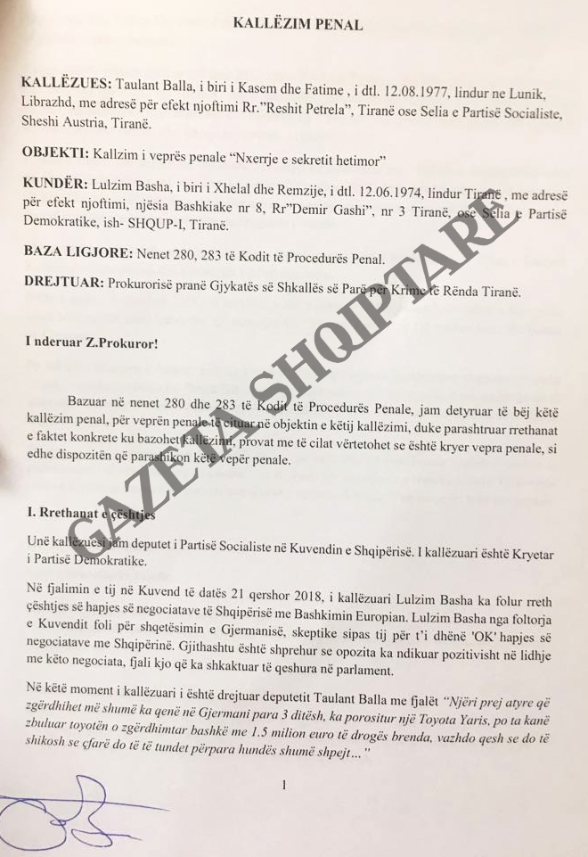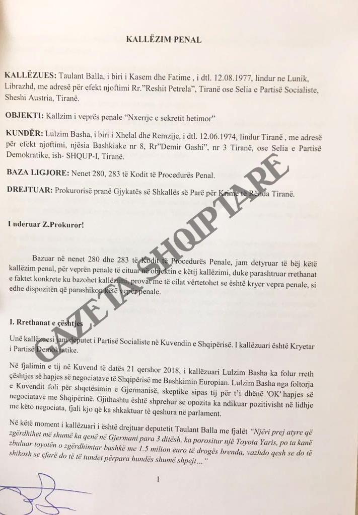 Taulant Balla ka kallëzuar penalisht kryedemokratin Lulzim Basha. Kallëzimin deputeti socialist e ka bërë në Gjykatën e Shkallës së Parë për Krimet e Rënda, ndërsa e ka zbuluar në emisionin “Politika Online” në News24.