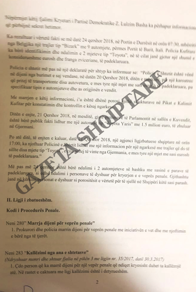 Taulant Balla akuzon kështu zotin Basha për nxjerrjen e sekretit hetimor, në lidhje me dy automjetet tip “Toyota Yaris” që u bllokuan në portin e Durrësit, brenda të cilave u gjetën rreth 3.4 milionë euro.
