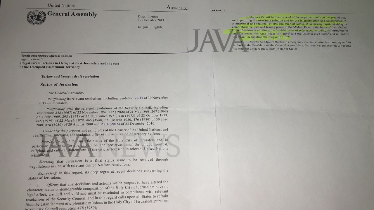 Rezoluta 2011: Shprehim gjithashtu shqetësimin e veçantë në lidhje me vazhdimin e fuqisë pushtuese nga Izraeli, aktivitetit të vendosjes së paligjshme, duke përfshirë edhe të ashtu-quajturin plan E-1, ndërimi i murit në dhe rreth Jeruzalemit LIndor, kufizimin në akses të qytetit dhe izolimin e mëtejshëm nga pjesa tjetër e Territorit Palestinez të Pushtuar, të cilat kanë ndikimi të dëmshëm për jetët e palestinezëve që mund ta paragjykojnë një marrëveshje përfundimtare për statusin e Jeruzalemit.
