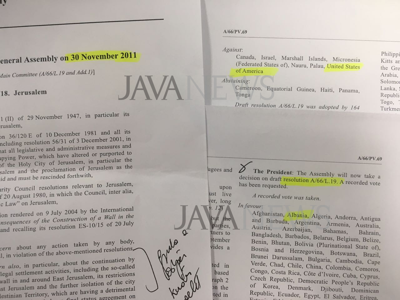 “Në L-19 për Jeruzalemin në vitin 2011, Shqipëria ka votuar pro, ndërsa SHBA kundër. Lehtësisht e dukshme gjuha e përdorur në vitin 2011 dhe ajo në vitin 2017 në dy rezolutat” – raporton JavaNews.