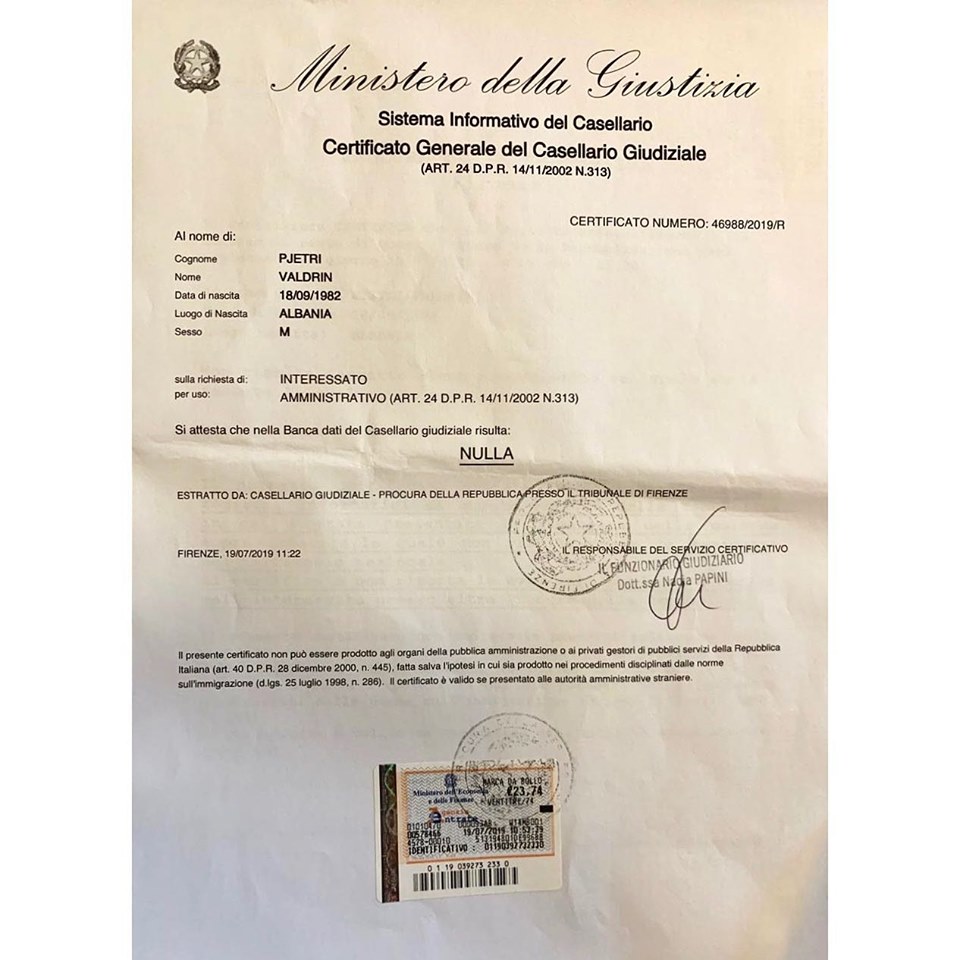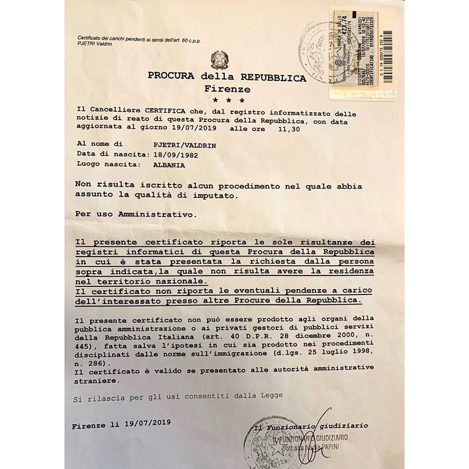 Pjetri poston në rrjetin social dy faksimile të certifikatave të shtetit italian, që vertetojnë pastërtinë e figurës së tij në Itali