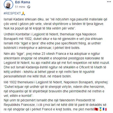 Teksa vlerëson maksimalisht Kadarenë, Rama shkruan se ky titull është i mirënjohur e admiruar në tërë botë dhe është nder që nga sot e tutje e ka edhe një shqiptar.