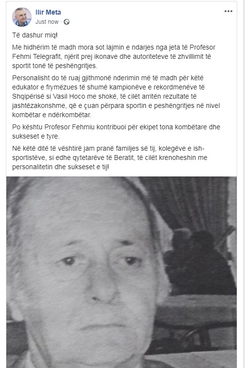 Në këtë ditë të vështirë jam pranë familjes së tij, kolegëve e ish-sportistëve, si edhe qytetarëve të Beratit, të cilët krenoheshin me personalitetin dhe sukseset e tij!”, shkruan Meta.