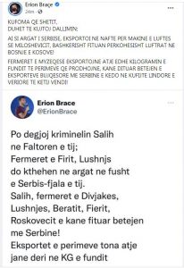 ‘Kufoma qe shetit, duhet të kujtoj dallimin; Ai si argat i Serbisë, eksportoi naftë për makinë e luftës së Miloshevicit, bashkërisht fituan përkohësisht luftrat në Bosnje e Kosovë! Fermerët e Myzeqesë eksportojnë atje edhe kilogramin e fundit të perimeve që prodhojnë, kanë dituar betejën e eksporteve bujqësore me Serbinë e këdo në kufijtë lindore e veriore të këtij vendi!’- shkruan Braçe.