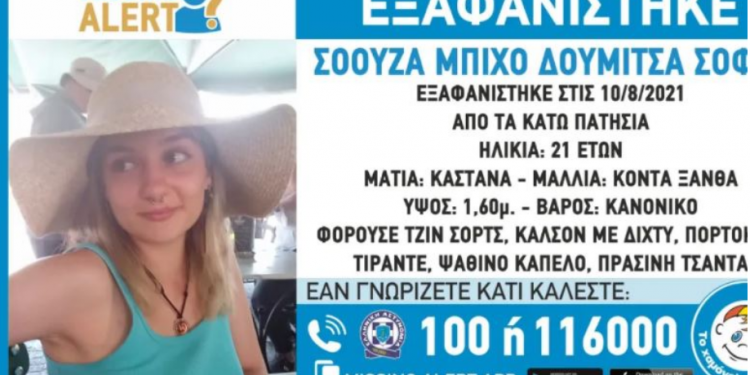Një 21-vjeçare portugeze është zhdukur në Greqi, ndërkohë që ishte me pushime. Mediat fqinje raportojnë se Sofia Souza Bicho Doumita humbi gjurnët nga zona e Kato Patissia, në orët e para të së martës,10 gusht.