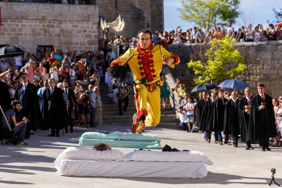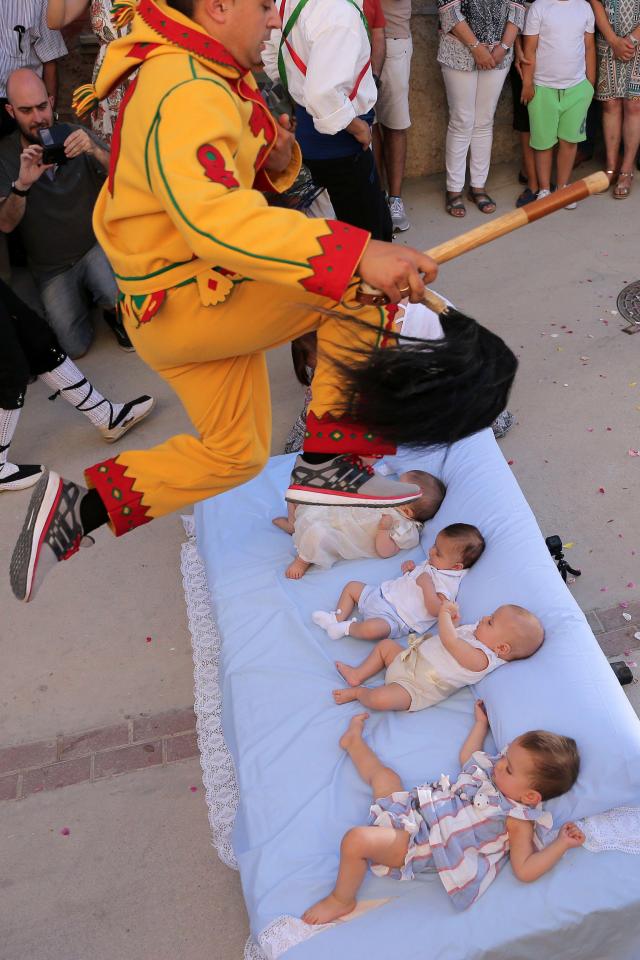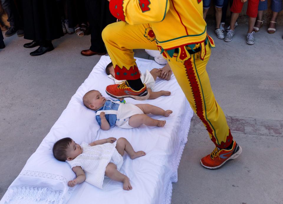 Papa i mëparshëm, Benedikti i XVI i kërkoi priftërinjve spanjoll të distancoheshin nga ky rrit, por ai është ende mjaft popullor. Foshnjat që kanë lindur në 12 muajt e fundit vendosen në dyshekë në qytetin spanjoll të Castrillo de Murcia. Më pas një person i veshur me të verdhë dhe të kuqe kërcen mbi dyshekët e fëmijëve shkruan The Sun.