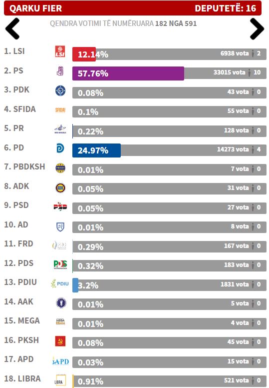Janë numeruar 182 kuti ne Qarkun e Fierit. Keshtu, rezultati deri tani eshte: PS 10 mandate, PD 4 mandate, LSI dy mandate.