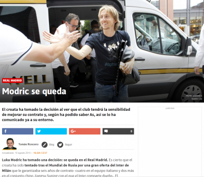 “AS” shkruan se kjo ka qenë dëshira e lojtarit që në fillim të kësaj historie pavarësisht se ai ka heshtur. Po sipas këtij burimi të afërm të lojtarit kanë konfirmuar se pas bisedës që ka patur me familjarët Modric ka vendosur përfundimisht të qëndrojë te Real Madrid.