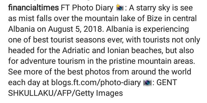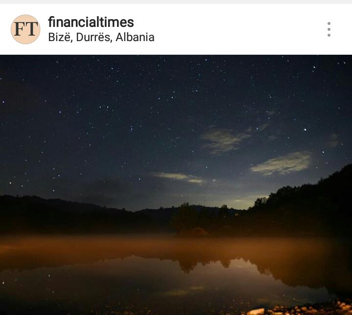Financial Times ka postuar në rrjetin e saj instagram një foto fantastike nga liqeni i Bizës në Durrës, duke shkruar se turistët e preferojnë Shqipërinë jo vetëm për plazhet e mrekullueshme të Adriatikut e Jonit, por edhe për turizmin e aventurës në zonat malore.
