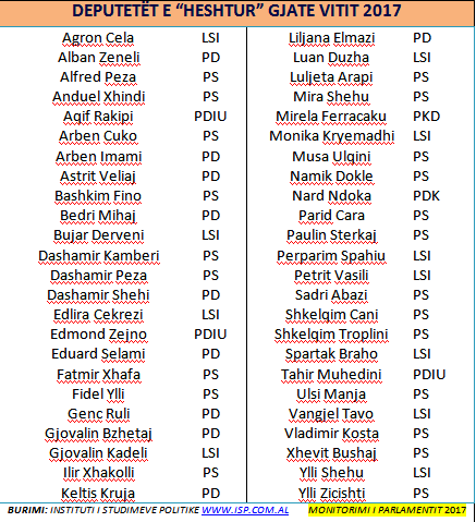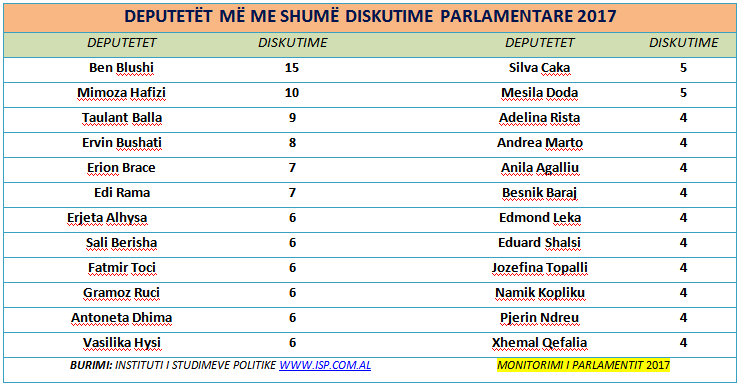 Per saktesim: Instituti i Studimeve Politike (www.isp.com.al) ka bërë monitorimin e pjesshëm të aktivitetit parlamentar gjatë periudhës janar-maj 2017. Monitorimi bazohet në dy elementë thelbësorë: nivelin cilësor të përfaqësimit nga deputetët të zgjedhësve të tyre (angazhimi në debate, problematika, komisione, interpelanca, seanca pyetjesh, etj), si dhe në sistemin e transparencës së institucionit dhe aktivitetit parlamentar me qytetarët (përfshirë nivelin e zbatimit të rregullores dhe akteve të tjera që rregullojnë aktivitetin e Kuvendit). Metodologjia është e njëjtë që aplikohet për një sërë parlamentesh dhe është pjesë e netëork-ut ndërkombëtar mbi parlamentin e hapur.