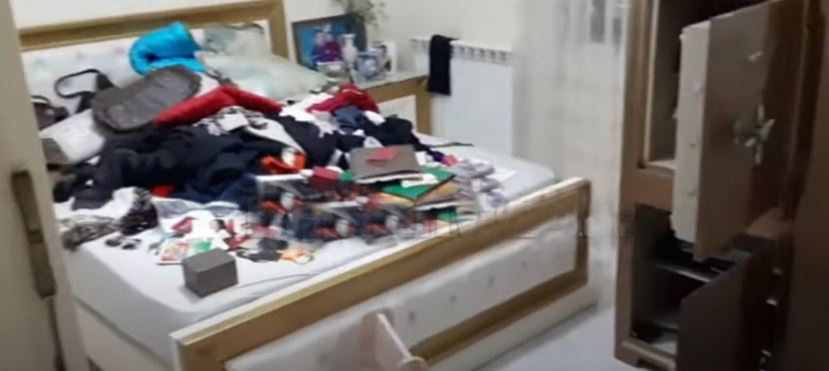 “U futën drejt për në kat të dytë. Kjo është dhoma e gjumit të çiftit, ja çfarë ka ndodhur këtu (dhoma e përmbysur). Ja kasaforta. (e hapur dhe e zbrazur).