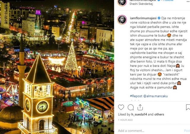 Flori shkruan në Instagram se mbrëmjen e djeshme ka qenë tek sheshi “Skënderbej” një një nga lokalet e improvizuara përballë pemës.