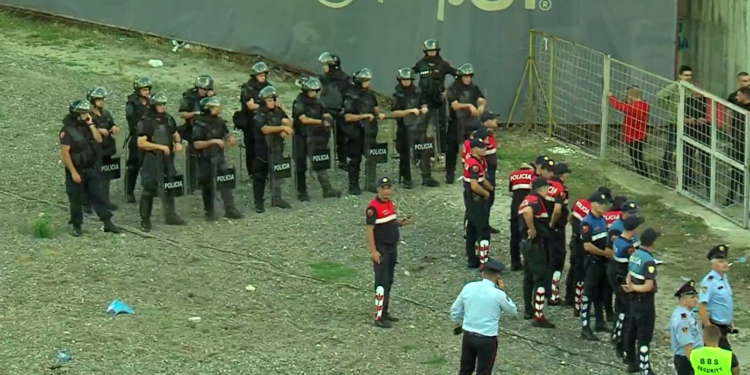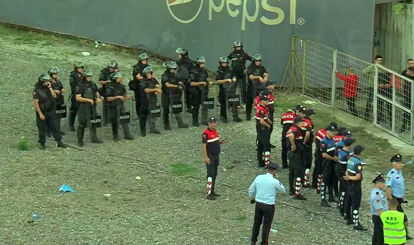 Pas përlasjes masive e cila ndodhi një orë para fillimit të derbit Tirana- Partizani, FNSH dhe Policia ka hyrë në stadium për të mbarëvajtur ndeshjen. Duket se është e pamundur që disa policë privatë të mbajnë për 90 minuta 8089 tifozë të cilët do të ndjekin derbin sot. Uniformat blu dhe FNSH janë pozicionuar kryesisht para tribunës ku ndodhen tifozët e Partizanit, për të mos pasur më përplasje me ata të Tiranës të cilët sot janë në shumicë.