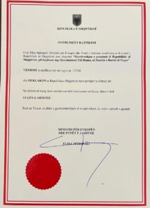 Ambasada e Shqipërisë në SHBA bëri me dije se sot është depozituar pranë Qeverisë së SHBA-ve origjinali i Instrumentit të Ratifikimit të marrëveshjes për pranimin e Shqipërisë në Kartën e Bordit të Paqes. Ambasada thekson se ky hap i jep fuqi të plotë juridike angazhimit të ndërmarrë.