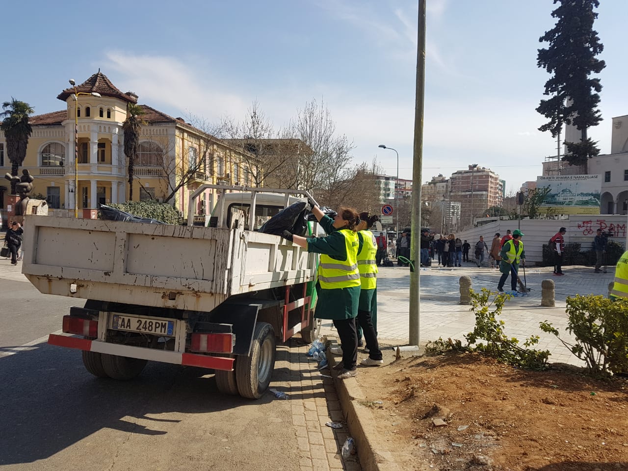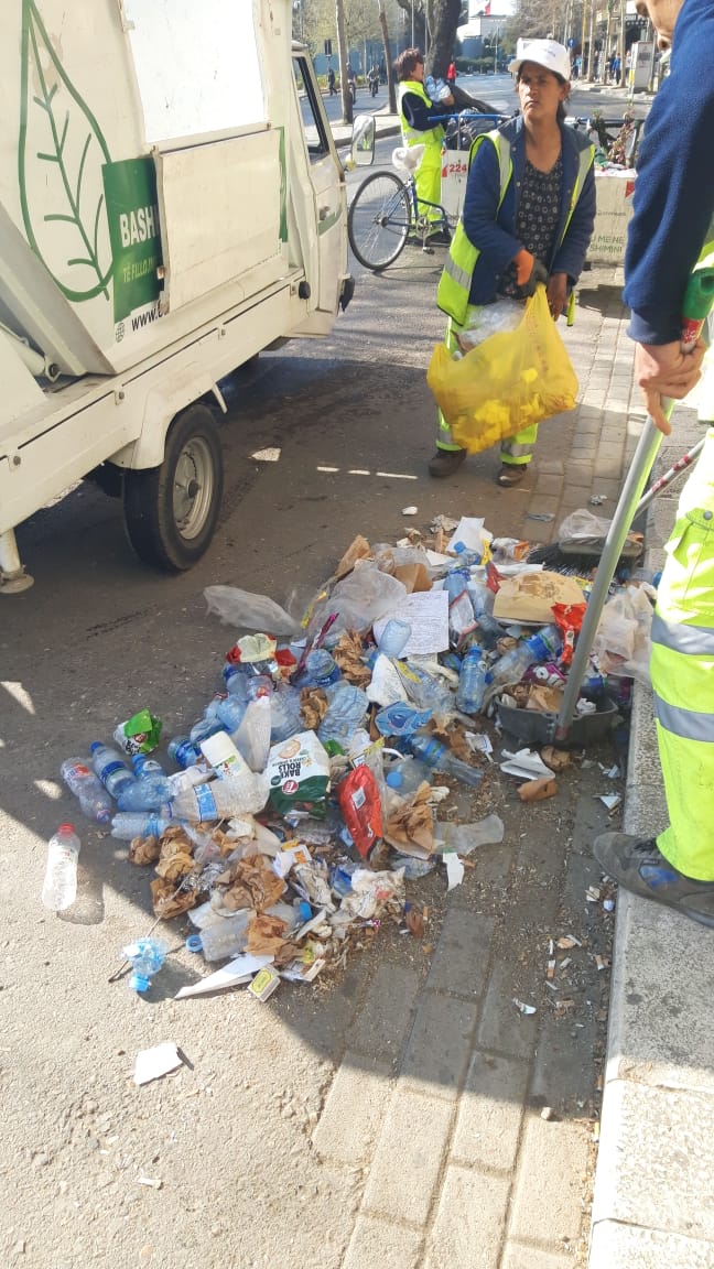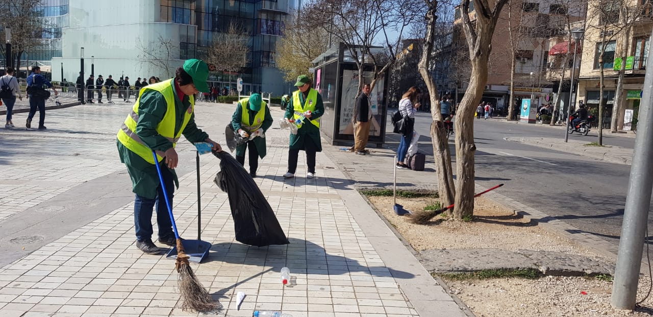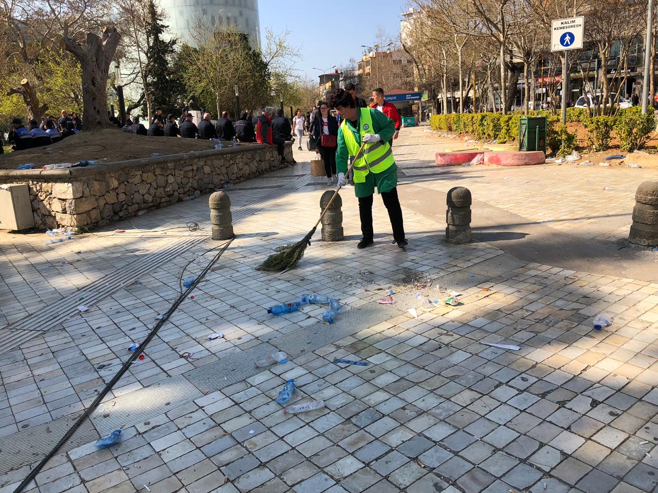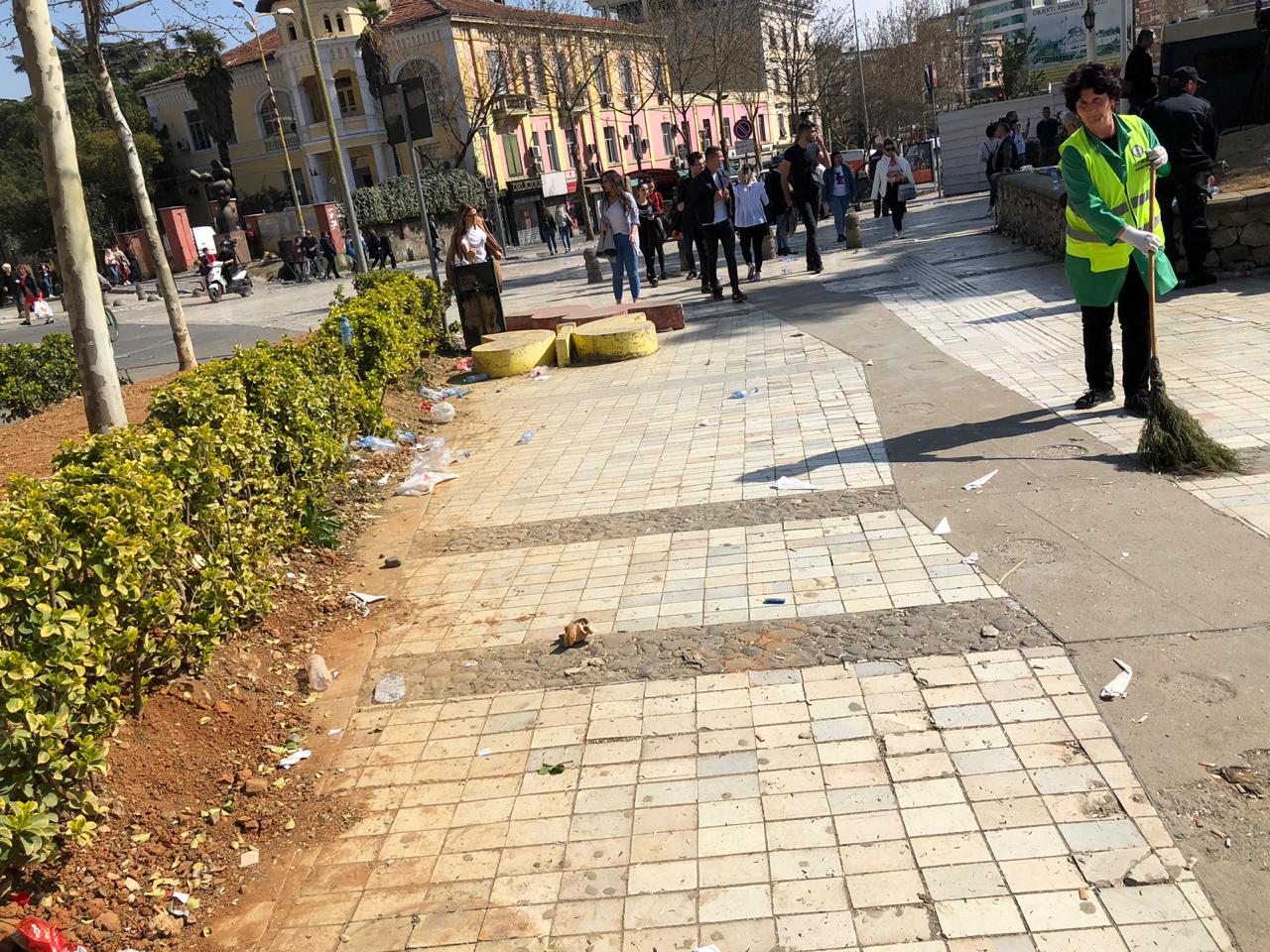 Ndërkohë, siç mund të shihni edhe nga këtë foto, me largimin e protestuesve, nisën menjëherë nga puna punonjëset e Bashkisë së Tiranës për pastrimin dhe rikthimin e normalitetit për qytetarët.