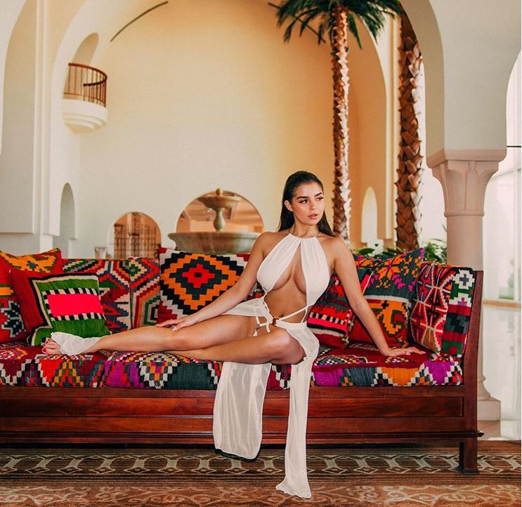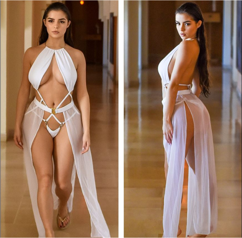 Brunja bombë e veshur me bikini të bardha, shumë të vogla për përmasat e saj, la pak vend për imagjinatën.
