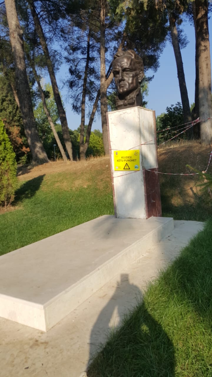 Rreth bustit tani janë vendosur shirita të verdhë plastmasi, ndërsa aty ku duhej të ishte emri i Mit’hatit, është vënë një tabelë e verdhe ku lexohet: “KUJDES! KËTU PUNOHET”.