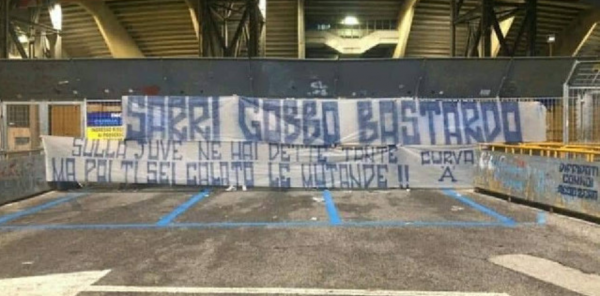 “Bastard! Ke thënë shumë gjëra më pas ule mbathjet!”. Këto janë fjalët e shkruara në një banderolë të vendosur jashtë stadiumit “San Paolo” nga tifozët ultras të Napolit që ofendojnë trajnerin Sarri i cili për herë të parë rikthehet si kundërshtar.