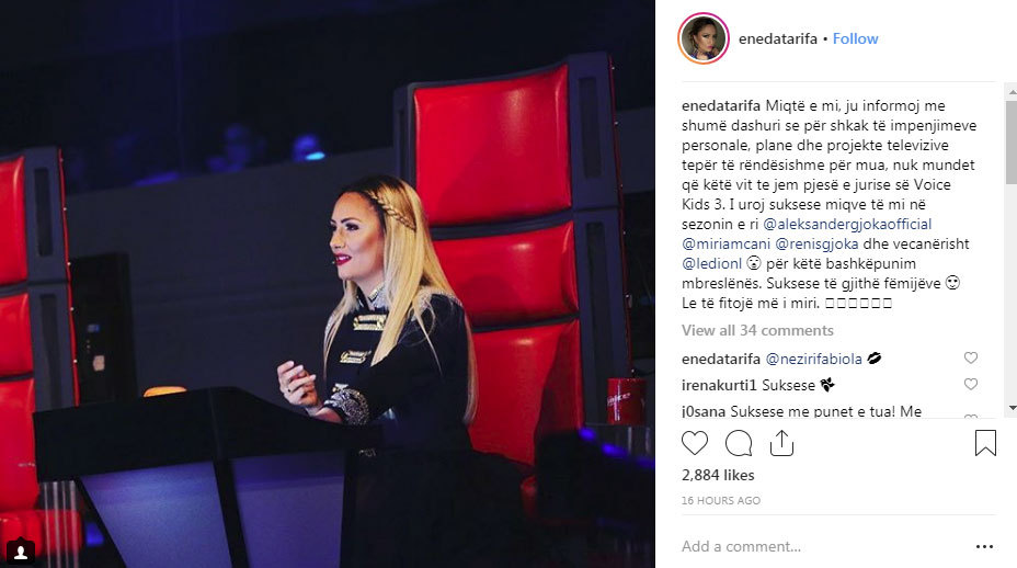 “Miqtë e mi, ju informoj me shumë dashuri se për shkak të impenjimeve personale, plane dhe projekte televizive tepër të rëndësishme për mua, nuk mundet që këtë vit te jem pjesë e jurise së Voice Kids 3. I uroj suksese miqve të mi në sezonin e ri, Aleksander Gjoka, Miriam Cani, Renis Gjoka dhe vecanërisht Ledion Liço për këtë bashkëpunim mbreslënës. Suksese të gjithë fëmijëve. Le të fitojë më i miri”, shkruan Eneda në Instagram./a.meta