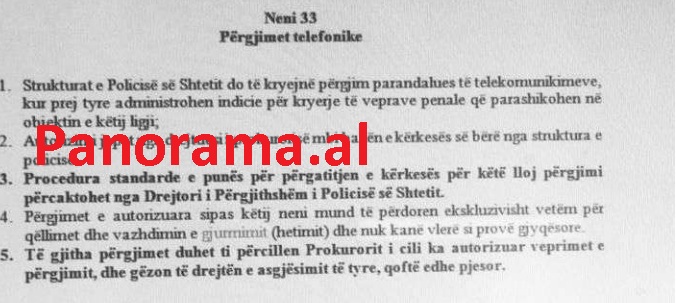 Në nenin 33 të pr/ligjit, për përgjimet telefonike, parashikohet se policia do të kryejë përgjim parandalues të telekomunikimeve kur prej tyre administrohen indicie për kryerje të veprave penale që parashikohen në objektin e këtij ligji dhe autorizimi do të jepet nga drejtuesi i prokurorisë mbi bazën e kërkesës së bërë nga struktura e policisë.