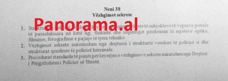 “Në nenin 38 të projektligjit, për vëzhgimit sekrete, në pikën 1 thuhet : “Strukturat e Policisë së Shtetit kryejnë vëzhgime sekrete të subjekteve të veprave penale të parashikuara në këtë ligj, fizikisht dhe nëpërmjet përdorimit të mjeteve optike, filmime, fotografime e pajisje të tjera teknike.