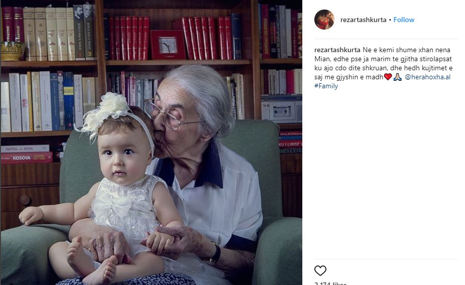 ‘Ne e kemi shume xhan nena Mian, edhe pse ja marim te gjitha stirolapsat ku ajo cdo dite shkruan, dhe hedh kujtimet e saj me gjyshin e madh @herahoxha.al #Family’ ka shkruar Rezarta në postimin e saj të cilin e ka shoqëruar me zemër./a.m.