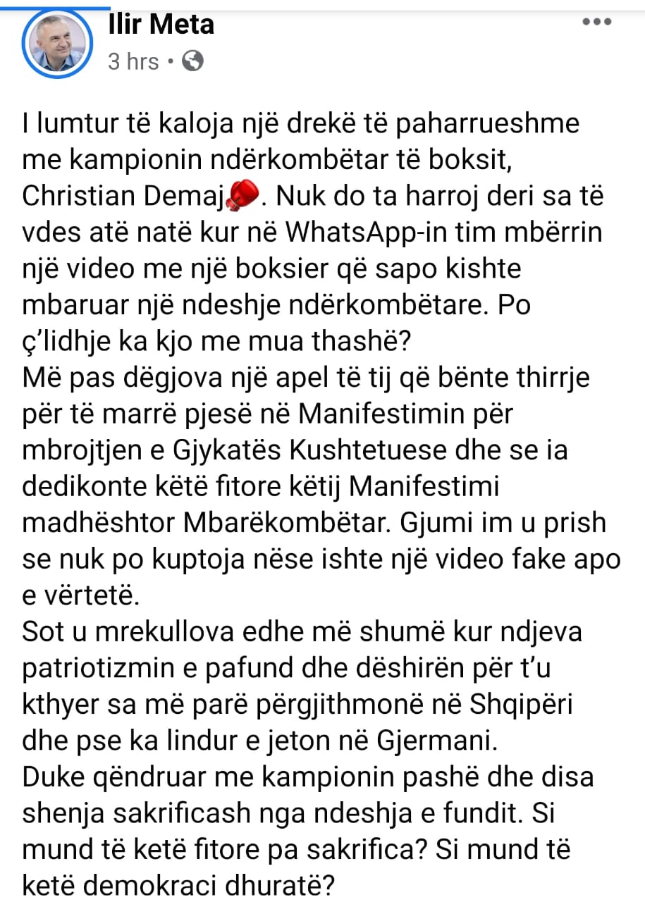 Ditën e sotme Ilir Meta ka publikuar në Facebookun e tij një foto me boksierin Kristian Demaj duke shkruar se ishte i mrekulluar nga një video që i kishte dërguar ky i fundit para ca kohësh në Whatsup. Nga ana tjetër Ilir Meta shkruan se edhe pse Demaj ka lindur dhe jetuar në Gjermani, ai ka erdhur apostafat për protestën e 2 marsit ku u tubua për mbrojtjen e Kushtetutës.