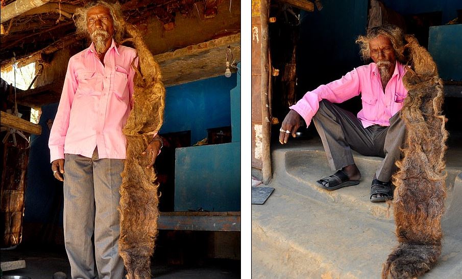 Sakal Dev Tuddu nga Munger i mban flokët sipër kokës në formën e një çallme.