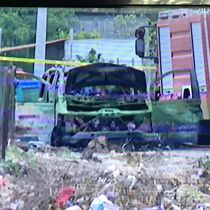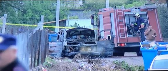 Ky është automjeti i gjetur i djegur në zonën e Tapizës në afërsi të Fushë Krujës, me të cilën u larguan grabitësit e armatosur nga aeroporti i Rinasit. Mjeti është shkrumbuar totalisht, pasi i është vënë flaka për të shkatërruar provat që mund të gjenden në të. Policia ka transportuar mjetin nga vendi ku u gjet. Në grabitje janë përfshirë katër persona, ndërsa njëri prej tyre mbeti i vrarë pas shkëmbimit të zjarrit me policinë. Viktima nuk është identifikuar ende nga policia. /a.meta