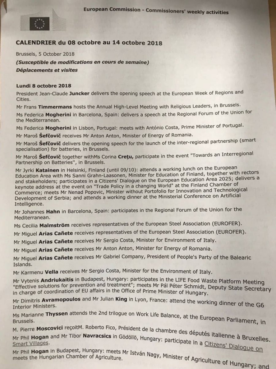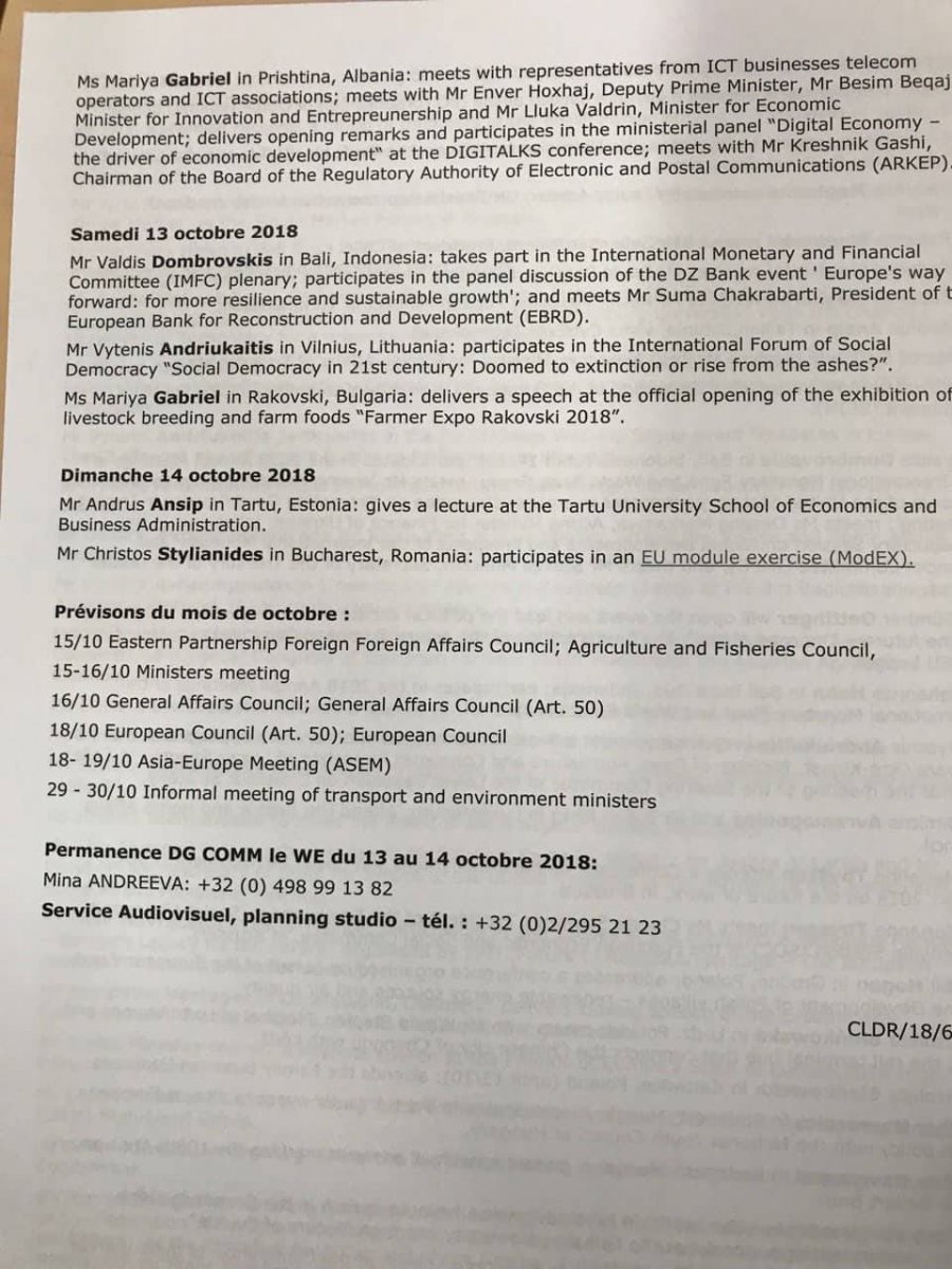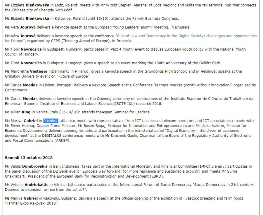 Në agjendën e aktiviteteve të komisionerëve, në paragrafin që kishte të bënte me Kosovën, njoftohej se Komisionerja për Ekonominë Digjitale, Marya Gabrial do të vizitonte Prishtinën e Shqipërisë më 12 tetor.