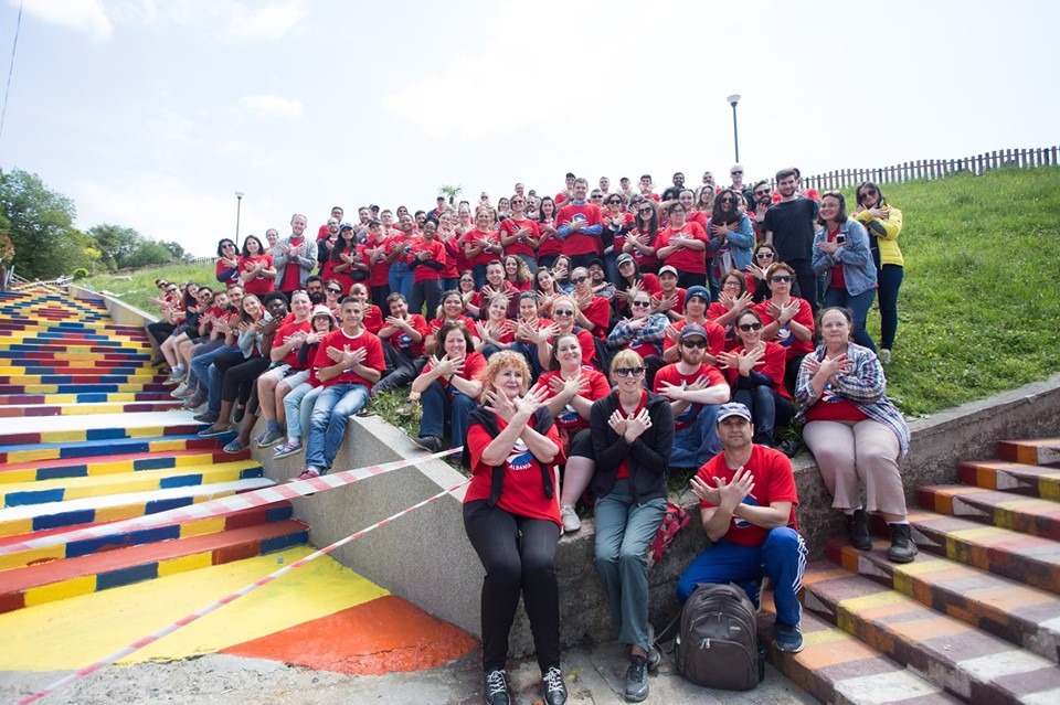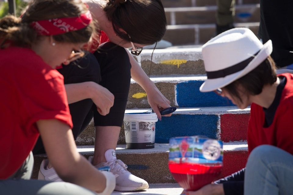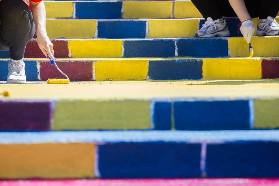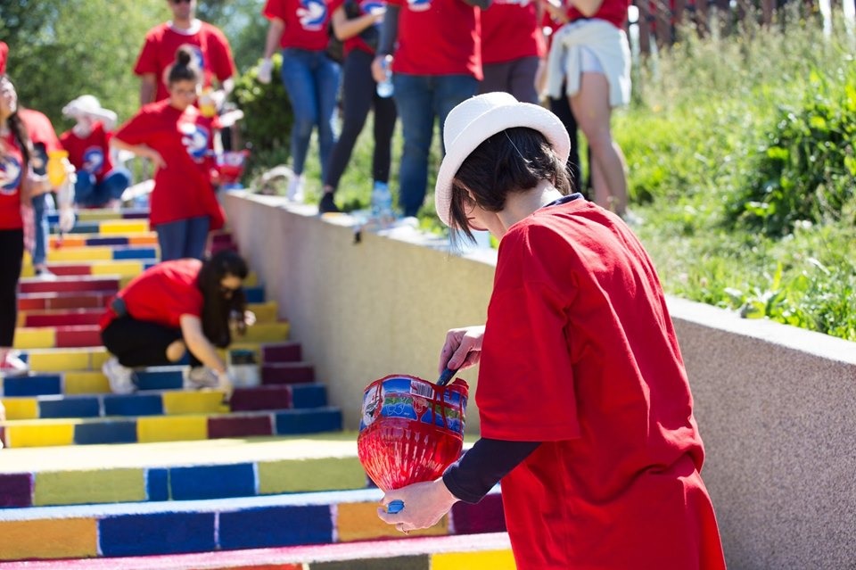 Vullnetarët e Korpusit të Paqes në Shqipëri së bashku me Dekor Tirana dhe stafin e Agjencisë së Parqeve dhe Rekreacionit në Bashkinë e Tiranës, kanë lyer qilimin me motive folklorike tek shkallët që zbresin nga diga e liqenit deri tek një prej rrugëve hyrëse në park.