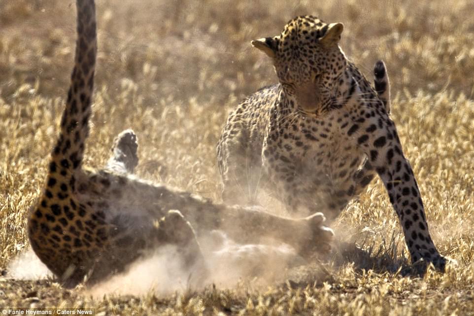 Dy leopard janë fotografuar teksa përlesheshin me njëra-tjetrën pranë shtratit të lumit Auob, në Kgalagadi Transfrontier Park in South Africa.