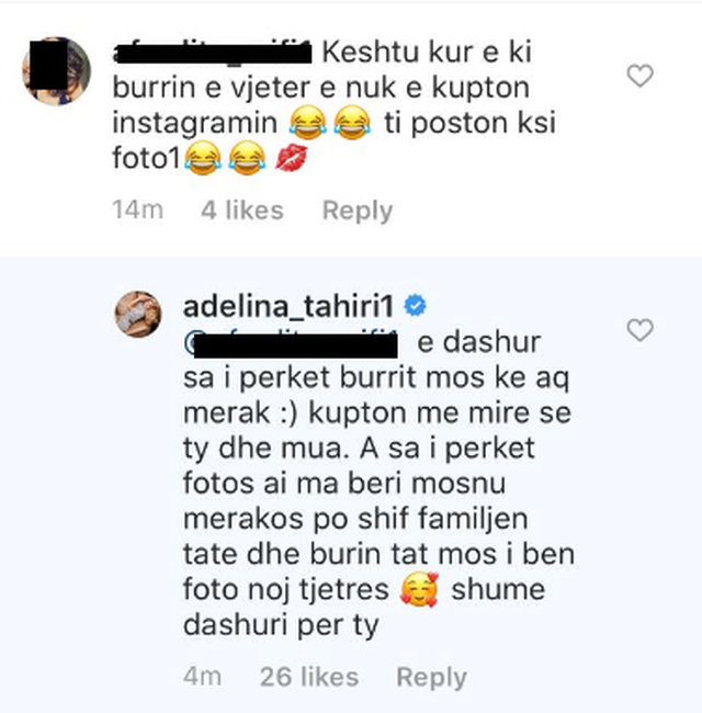 Poston kështu fotosh”, i komenton një ndjekëse Adelinës dhe kjo e fundit nuk ia ka kursyer përgjigjen. “E dashur, sa i përket burrit mos ki kaq merak. Kupton më mirë se ty dhe mua. A sa i përket fotos ai ma bëri, mos u merakos po shih familjen tënde dhe burrin tënd, mos i bëjë foto ndonjë tjetrës. Shumë dashuri për ty”, i përgjigjet Adelina.